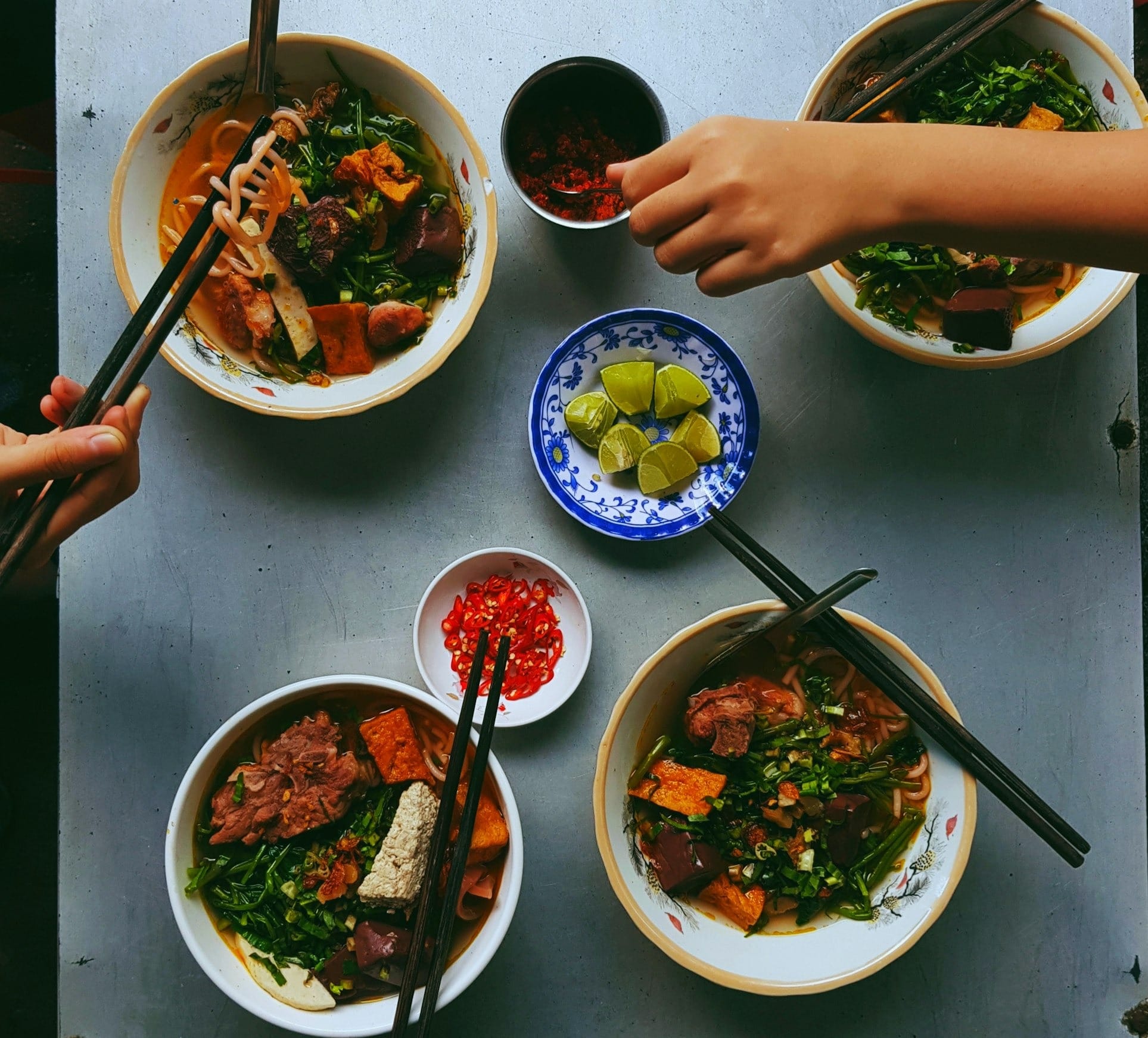 Les garnitures varient selon les régions et les préférences personnelles. Vous pouvez vous attendre à trouver des tranches fines de viande de bœuf ou des morceaux de poulet, des boulettes de viande, des oignons verts émincés et du céleri local. La présentation inclut systématiquement une assiette d'accompagnements frais : basilic thaï, menthe, coriandre, germes de soja croquants, quartiers de citron vert et piments frais.