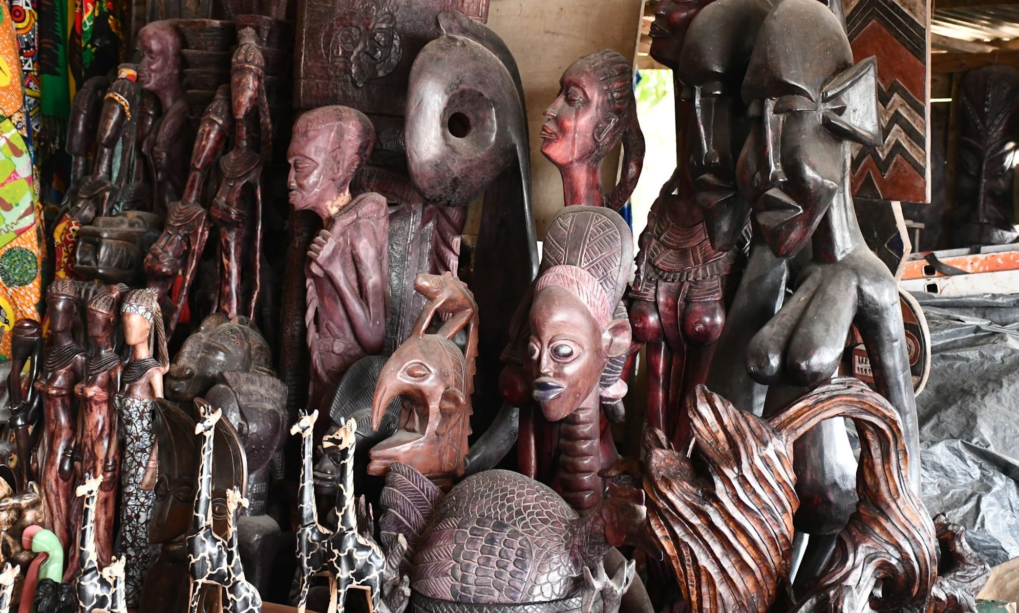Les sculpteurs béninois transforment le bois en véritables œuvres d'art. Vous découvrirez des statues représentant des divinités vaudou, des masques cérémoniels, des animaux totémiques et des scènes de vie quotidienne. Chaque pièce raconte une histoire et porte une signification culturelle profonde. Le bois d'ébène, l'acajou et le teck sont les essences les plus utilisées. Les sculptures varient en taille, des petites statuettes de quelques centimètres aux pièces monumentales. Privilégiez les pièces sculptées à la main plutôt que les reproductions industrielles pour garantir l'authenticité.