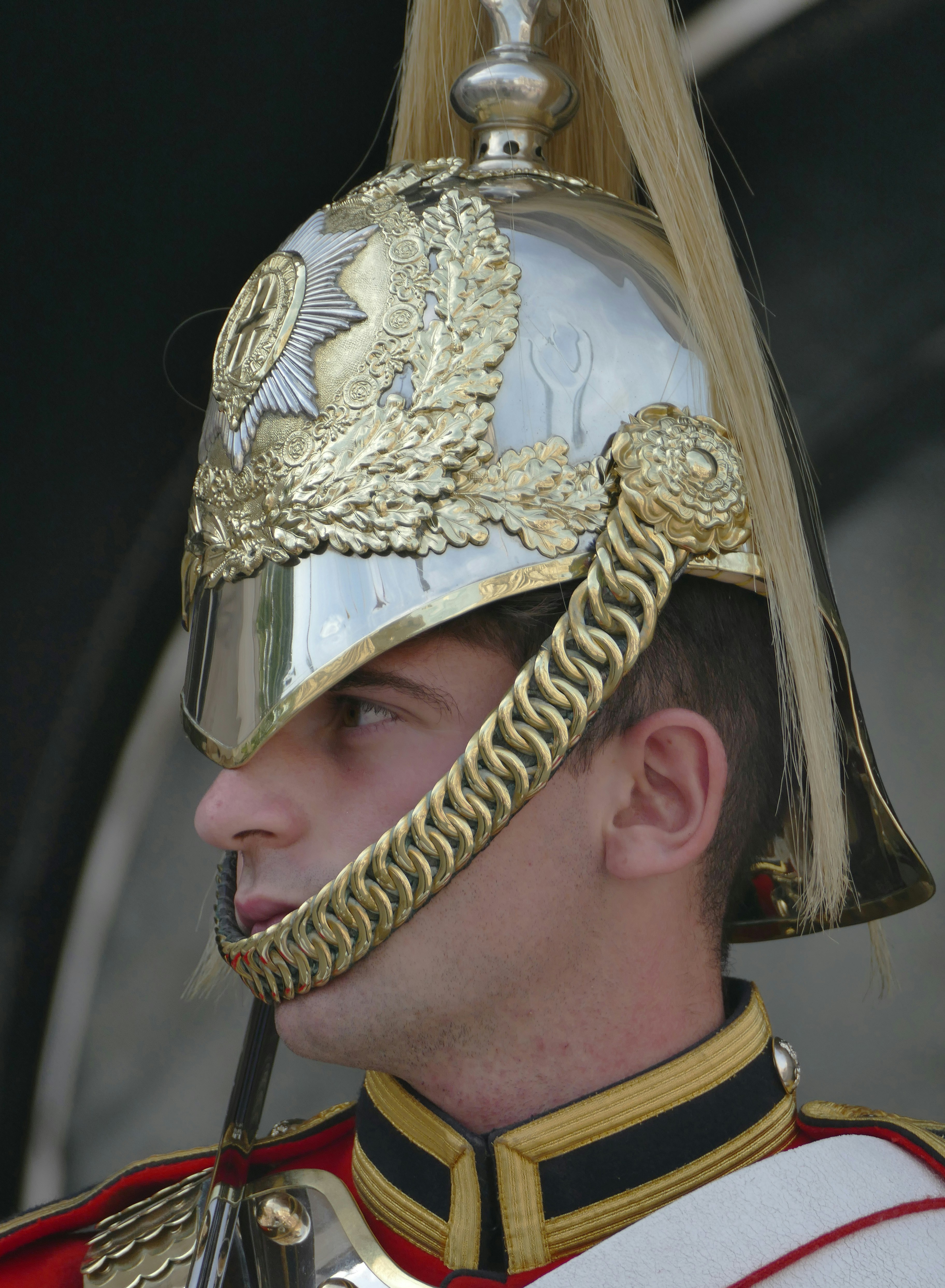 Les régiments se distinguent par leurs tenues traditionnelles : tuniques rouges et chapeaux en poils d’ours. Les différences visuelles incluent les boutons (groupés par 3 pour les Scots Guards, espacés régulièrement pour les Grenadiers Guards) et les plumets colorés sur les bonnets (bleu à droite pour Irish Guards, vert et blanc à gauche pour Welsh Guards, rouge à droite pour Coldstream Guards).